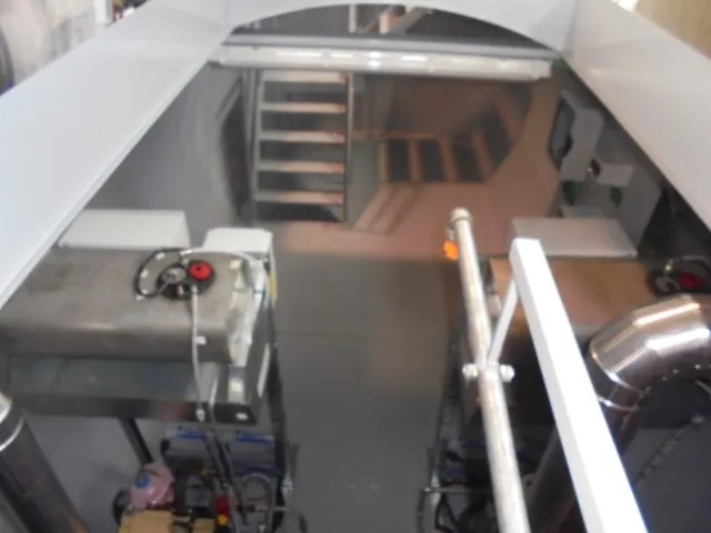 Sul fondo è presente una lamiera bugnata antiscivolo con rinforzi idonei all’installazione del gruppo antincendio e della scala d’ingresso a doppia rampa realizzata in acciaio con pedata e alzata pari a 220 mm posizionati dal fondo ad una quota di circa 600 mm. Sulla parte superiore è presente un boccaporto di dimensioni 1200 x 2200 x 400 mm con manicotti per passacavi per alimentazioni elettriche.